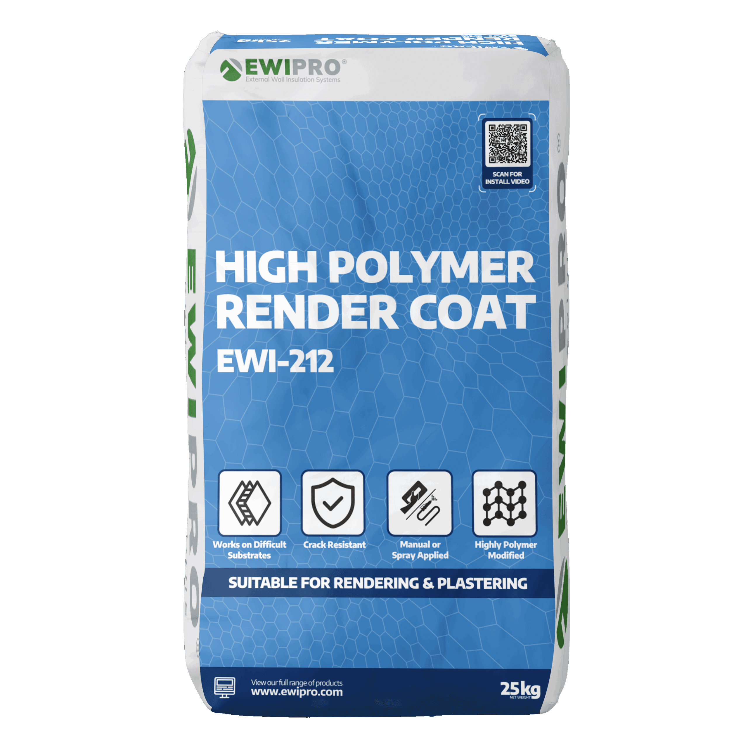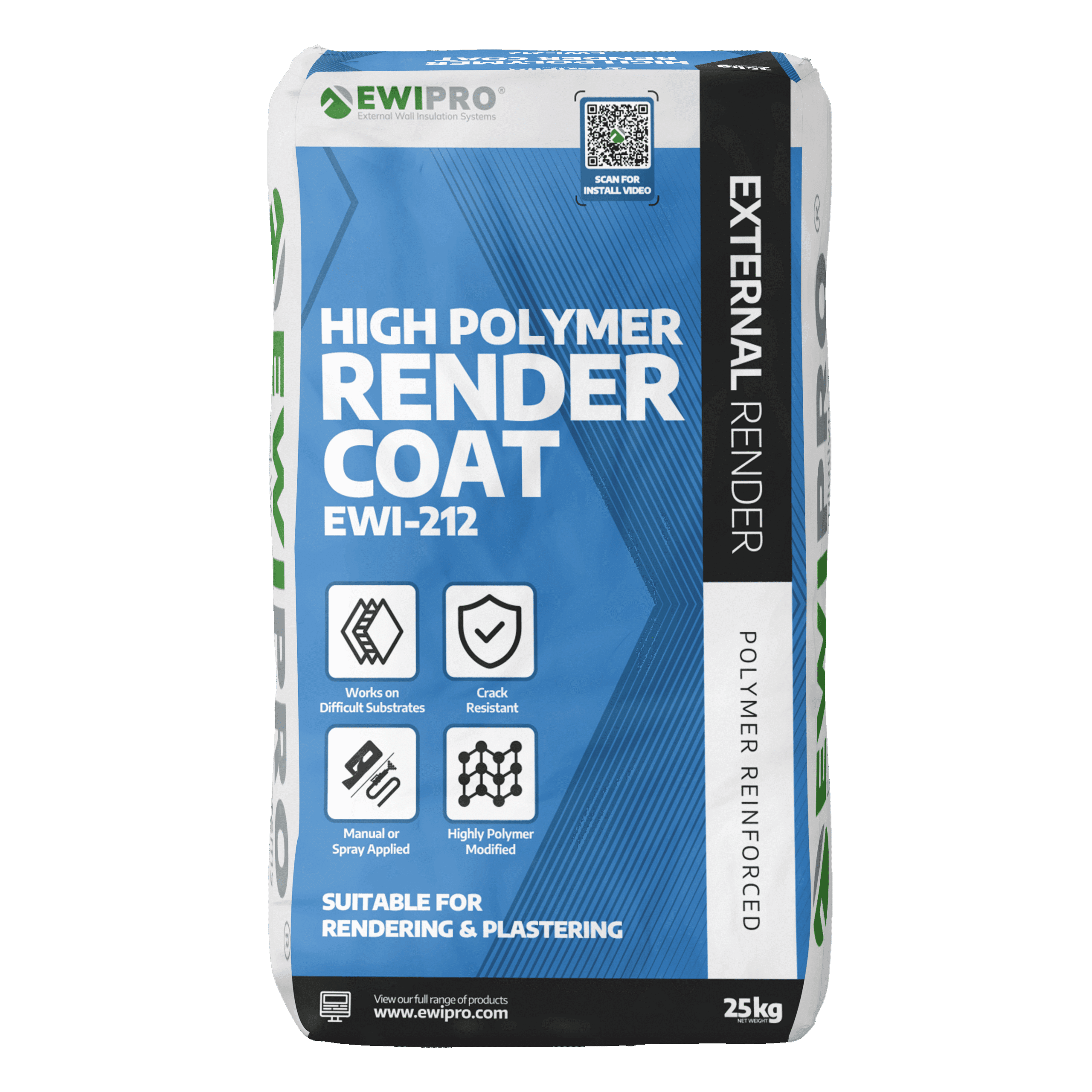 EWI-212 High Polymer Render Coat is a polymer-modified, cementitious basecoat supplied in 25kg bags. It levels and stabilises backgrounds, providing a durable, high-adhesion foundation for subsequent render finishes. The workable, polymer-enhanced formulation suits both hand and spray application. It cures to a weather-resistant, vapour-permeable layer that can be lightly scratched for keying or floated to a smooth, even surface.